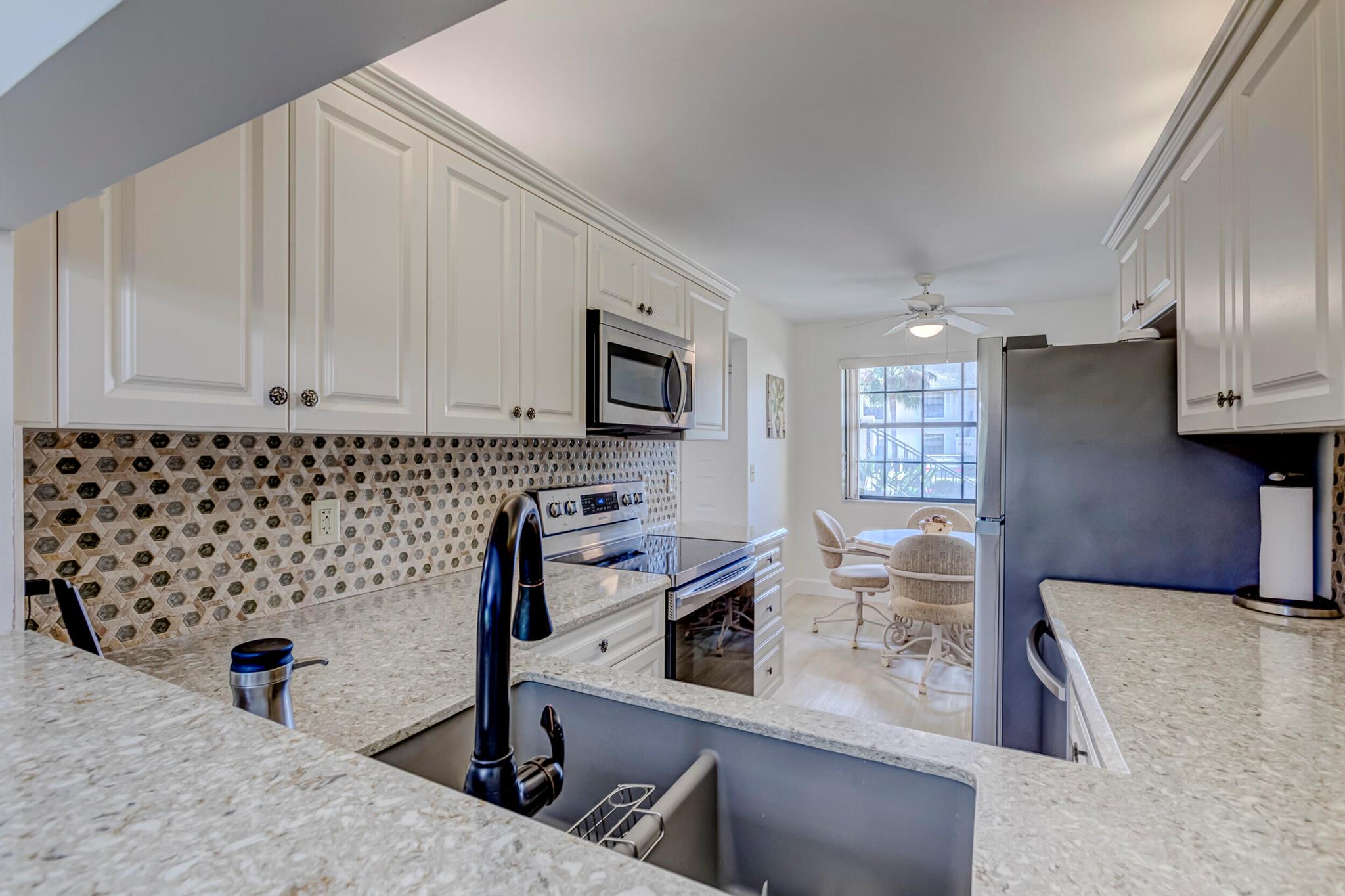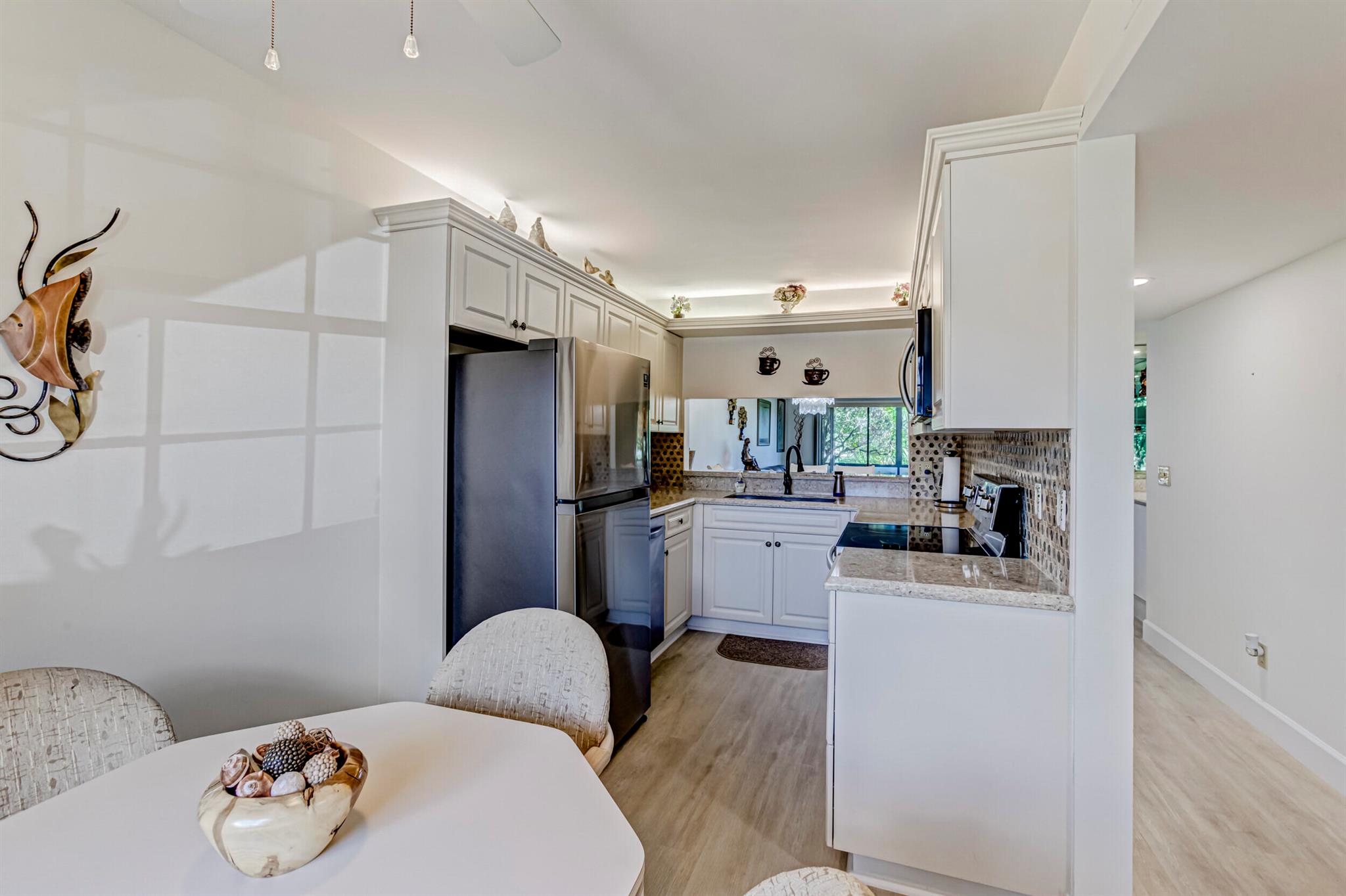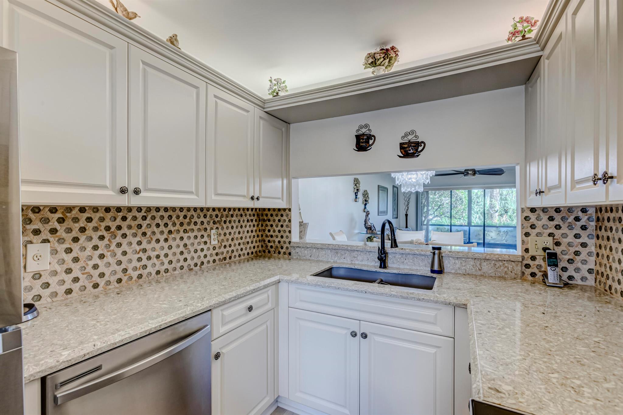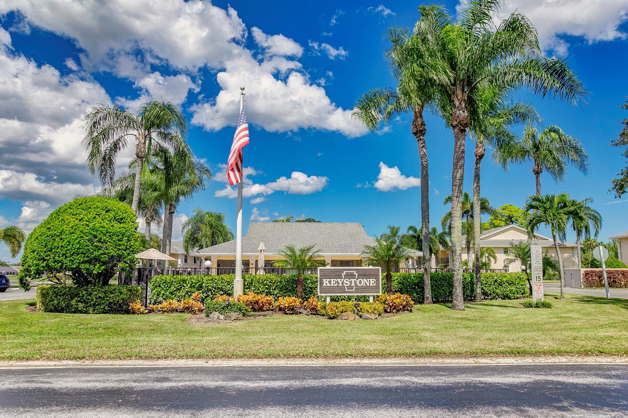 Great location!!!! This updated two bedroom two bath first floor unit facing the golf course has appliances only two years, luxury vinyl floors throughout, security system and accordion shutters. The kitchen has a breakfast area, as well as Quartz counters and stainless steel appliances. The guest bedroom comes with a Murphy bed has a walk-in closet. The master bedroom has a slider to the patio, walk-in closet and the bathroom has been remodeled. Keystone has a community center and swimming pool. The golf course is public and has a restaurant just half a mile away. This location is close to the beach 95 and lots of shopping. Enjoy Jupiter at its best. HOA fees of $492 a month that includes cable and exterior insurance. The first year cannot be rented.